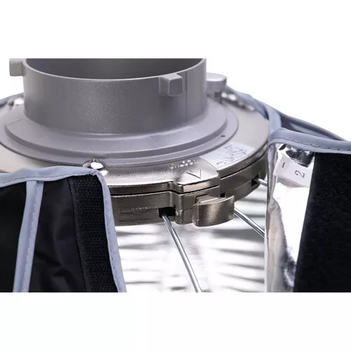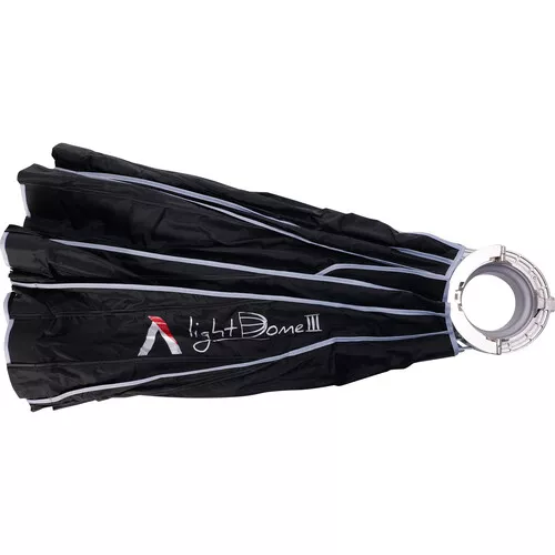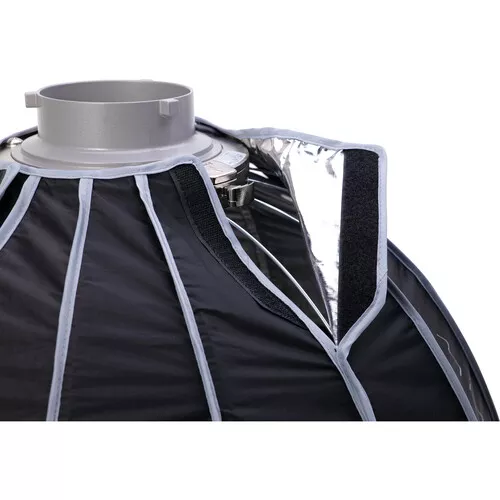 CompareBundled with a fabric honeycomb grid add-on that helps control the light spill spread by 40 degrees, and suitable for portraits, head shots, interviews, and fashion, the 34.8″ APUTURE LIGHT DOME II is a 16-sided modifier that offers quality of light options and wide compatibility with Aputure lights, as well as those of the many other manufacturers that use the popular Bowens front accessory mount. The structure of the Light Dome II is fortified by its 16 durable steel support rods, while its silver interior maximizes your light source’s output. Its 24″ depth produces a focused light with directional control that can be narrowed further for selective lighting with the included 40° fabric grid. Aputure provides a removable inner diffuser and both 1.5-stop and 2.5-stop front diffusers that you can use individually or all at once for softness and contrast options. The supplied gel filter holder also offers creative color options. Any way you use it, you’ll find that the Light Dome II renders soft, flattering light with a wraparound quality and produces round, natural-looking catchlights in the eyes of your subject.